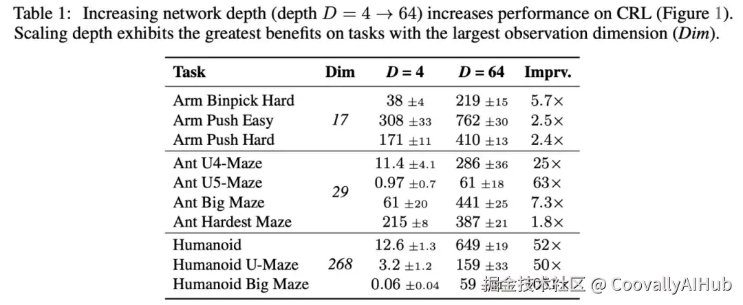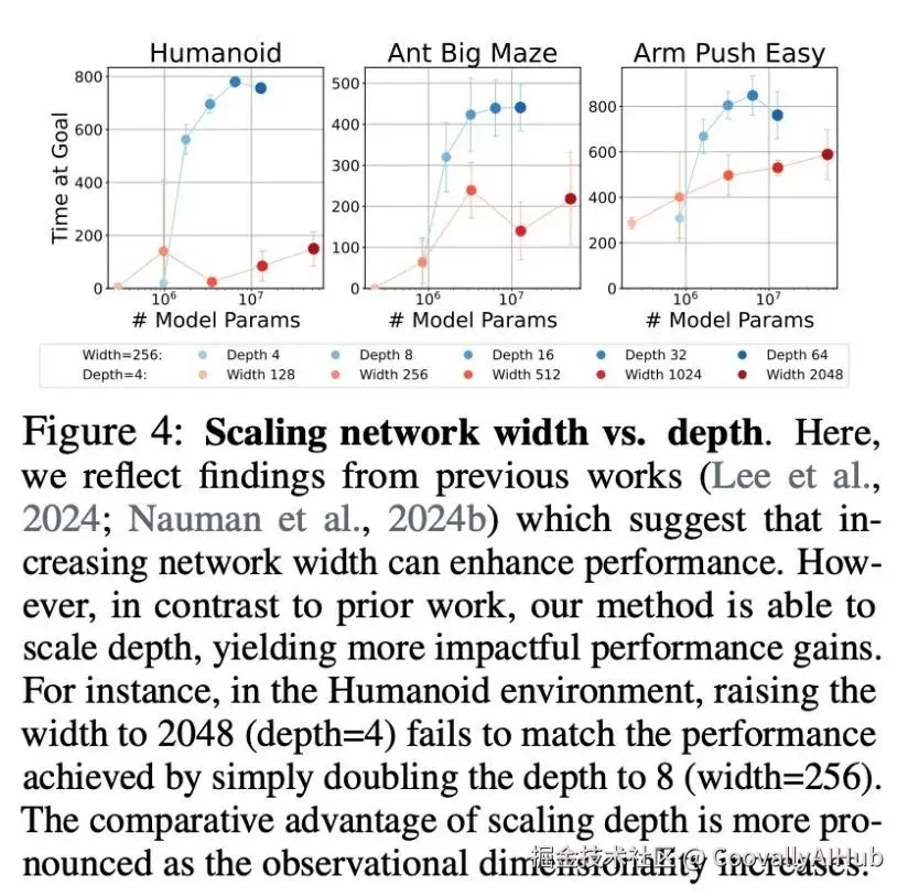 - 网络架构中的深度扩展:虽然许多先前的RL工作主要关注增加网络宽度,但他们通常在扩展深度时报告有限甚至负回报。相比之下,我们的方法解锁了沿深度轴扩展的能力,产生的性能改进超过了仅扩展宽度所带来的改进。