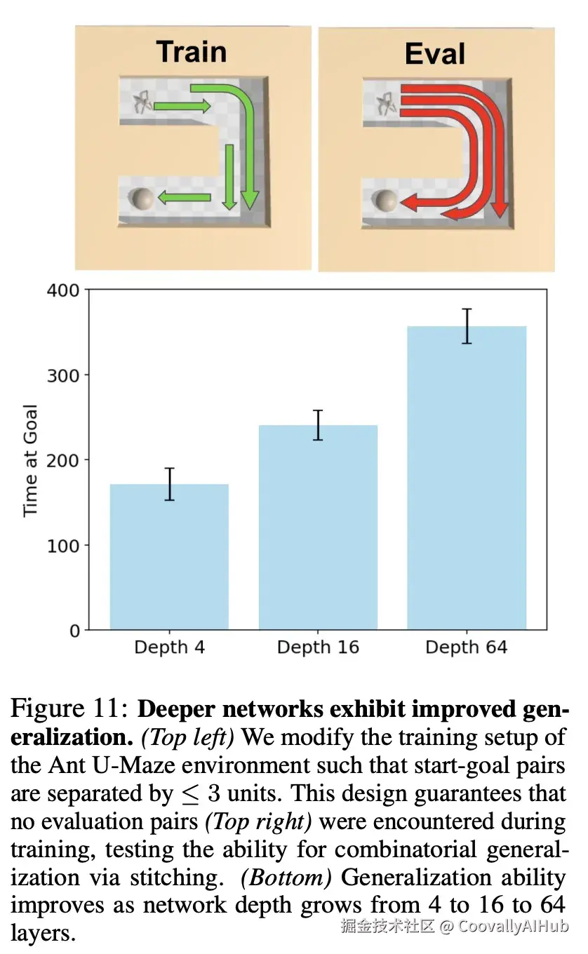 在泛化实验中,训练只使用最多3个单位距离的起始-目标对,但测试要求解决6个单位距离的任务。结果显示,深度4网络泛化能力有限,深度16网络取得中等成功,而深度64网络表现出色,表明更深网络能够将短距离经验“缝合”起来解决长距离任务。