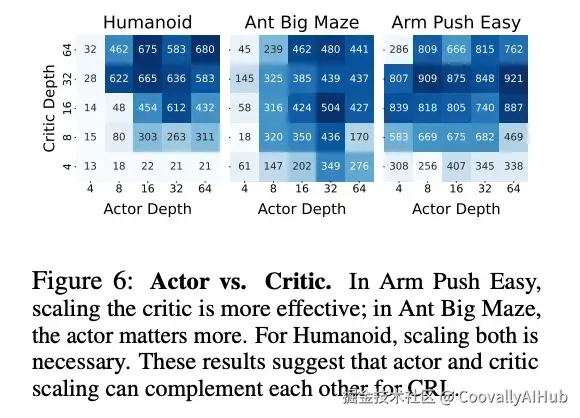 扩展行动者vs评论家网络。为了研究行动者和评论家网络中扩展的作用,图6展示了三个环境中不同行动者和评论家深度组合的最终性能。先前的工作侧重于扩展评论家网络,发现扩展行动者会降低性能。相比之下,虽然我们确实发现在三个环境中的两个(Humanoid, Arm Push Easy)中扩展评论家影响更大,但我们的方法受益于联合扩展行动者网络,其中一个环境(Ant Big Maze)显示行动者扩展的影响更大。因此,我们的方法表明,扩展行动者和评论家网络可以在提高性能方面发挥互补作用。