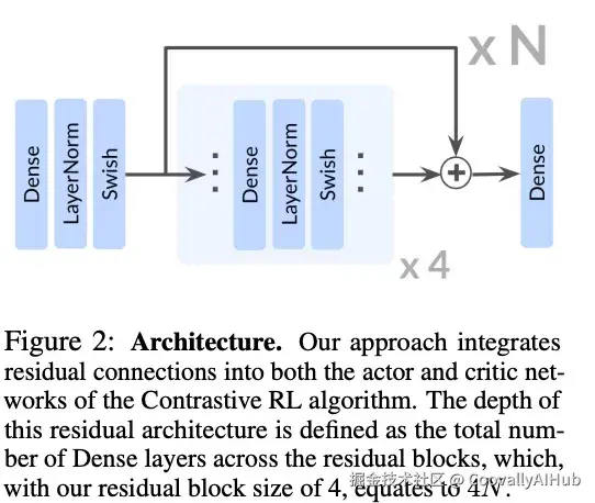 我们采用了ResNet架构中的残差连接,每个残差块由四个重复单元组成,每个单元包括一个全连接层、一个层归一化层和Swish激活函数。我们在残差块的最终激活之后立即应用残差连接,如图2所示。在本文中,我们将网络的深度定义为架构中所有残差块的全连接层总数。